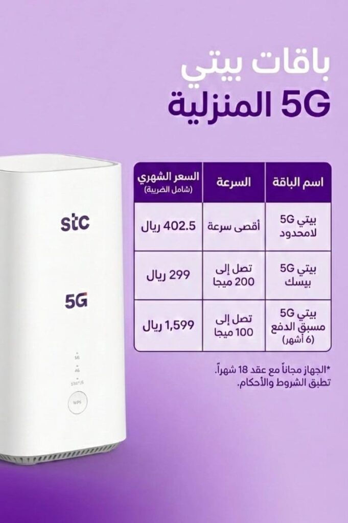 سرعة تحميل تصل الى 200 ميجابت/ للثانية سرعات عالية اشتراك مجاني على stc tv stc tv انترنت لامحدود راوتر مجانا للتأسيس الجديد توصيل مجانا و سربع الشبكة تدعم 5G & 4G تغطية الباقة ضمن نطاق المنزل ولاتعمل بشكل متنقل، الا من خلال طلب نقل مره واحده شهرياً 299ريال شهريا