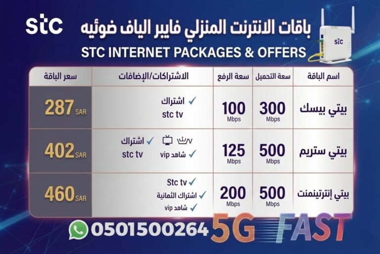 سرعة التحميل تصل الى 500Mbps وسرعة الرفع تصل الى 200Mbps شاهدvipوشاهد الرياضيه وقنوات الثمانيه تركيب مجانا مكالمات محلية و داخلية مجانا لأي هاتف ثابت الاستخدام الشهري للأنترنت لامحدود الربط مع حساب stc play الحصول على رصيد 50 ريال 460ريال شهريا